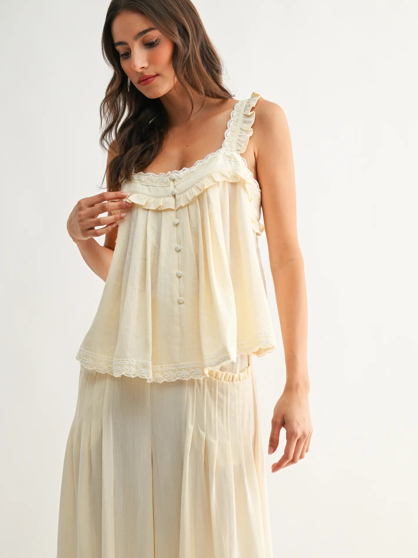 A fun and flowy top with dainty floral embroidery along the straps and hem and button detailing down the front.
